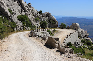 Jetzt folgt der Einstieg in den Berg. Die Straße wandelt sich in eine Schotterpiste. Wir befahren den Mali Alan Pass. Schon nach wenigen Kehren hat man einen Blick auf die Autobahnraststätte Sveti Rok und auf etwa halber Strecke erreicht man die Kapelle Sv. Frane.
